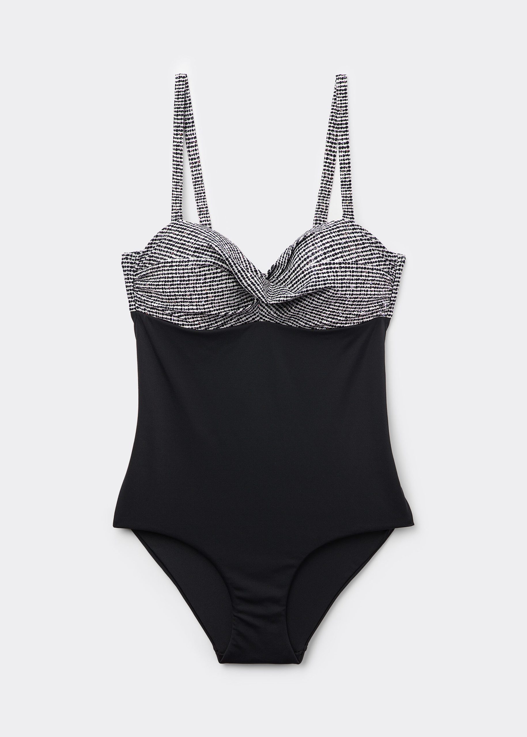 One piece swimsuit with lightly padded cups and underwire. Shaping effect on the abdomen. The style features a black and white toned pattern embellished with a coated effect. Fully lined in back. Regular bottom coverage in back.
