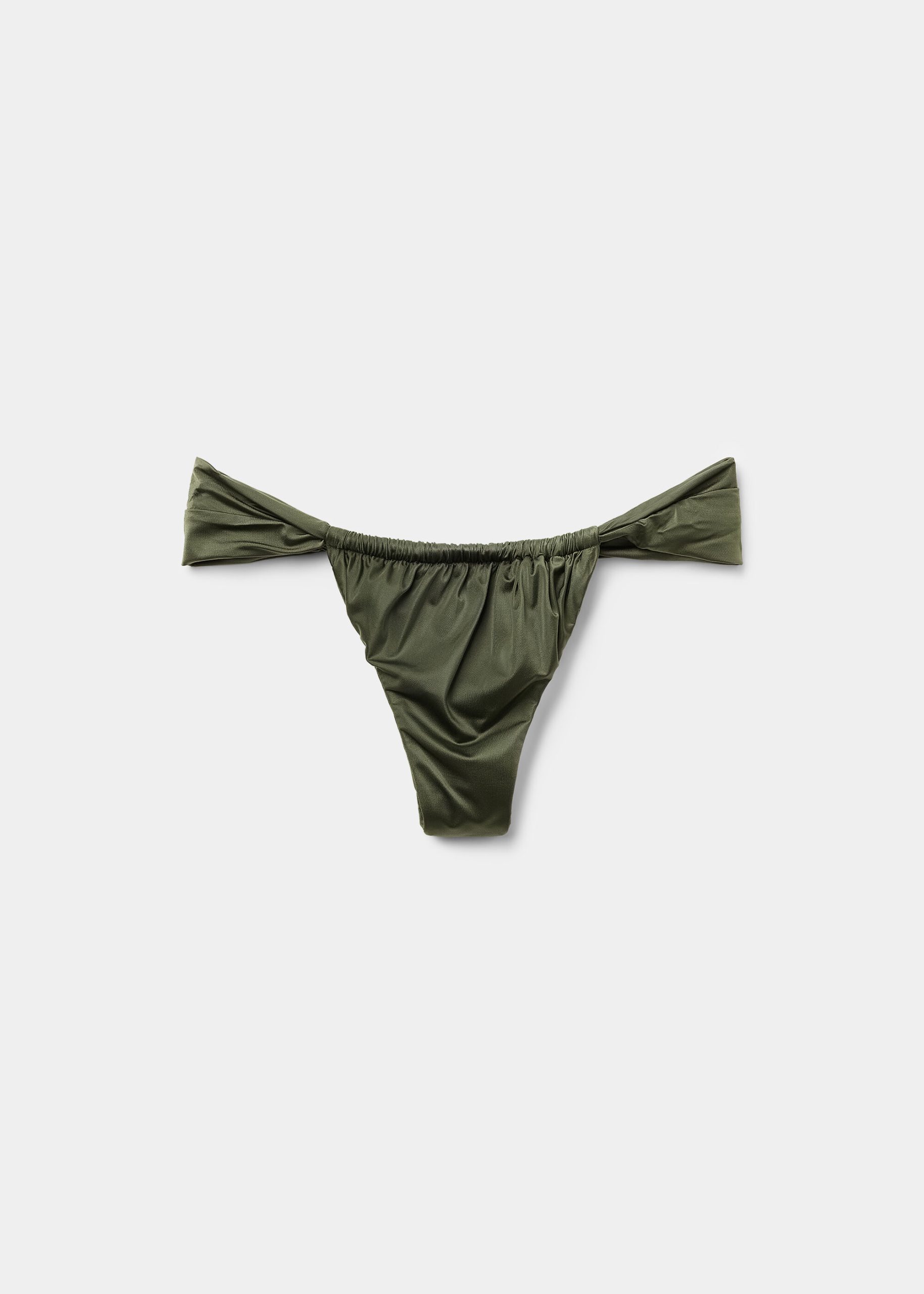 Brazilian bikini bottom with soft sides, featuring a bright fabric with a silky effect with ruffles. Fully lined with invisible seams.