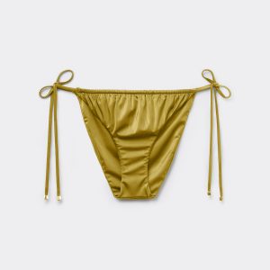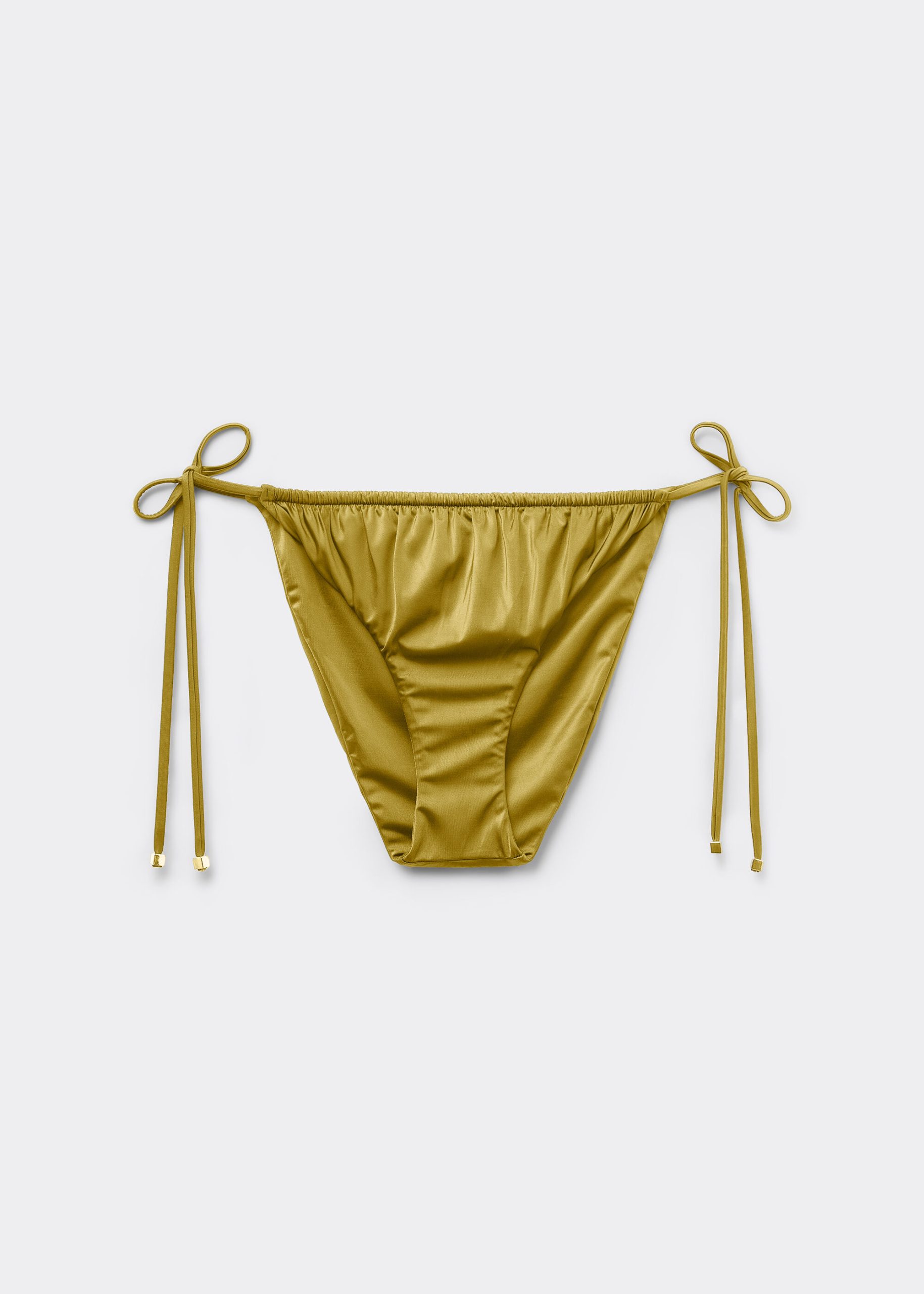 Bikini bottom with side ties to adjust the fit. The style features a bright fabric with a silky effect, embellished by ruffles and gold tips. Fully lined with invisible seams.