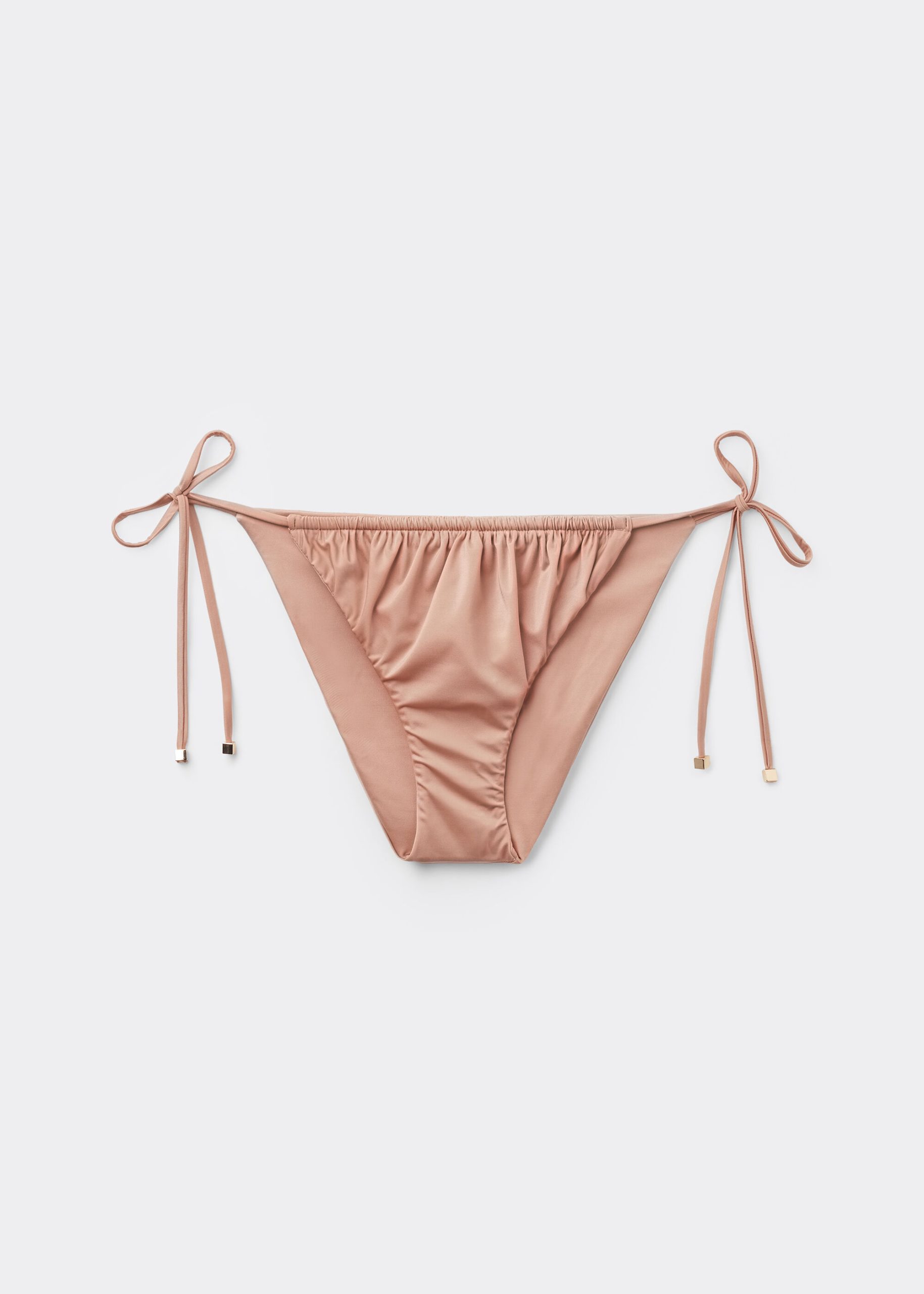Bikini bottom with side ties to adjust the fit. The style features a bright fabric with a silky effect, embellished by ruffles and gold tips. Fully lined with invisible seams.