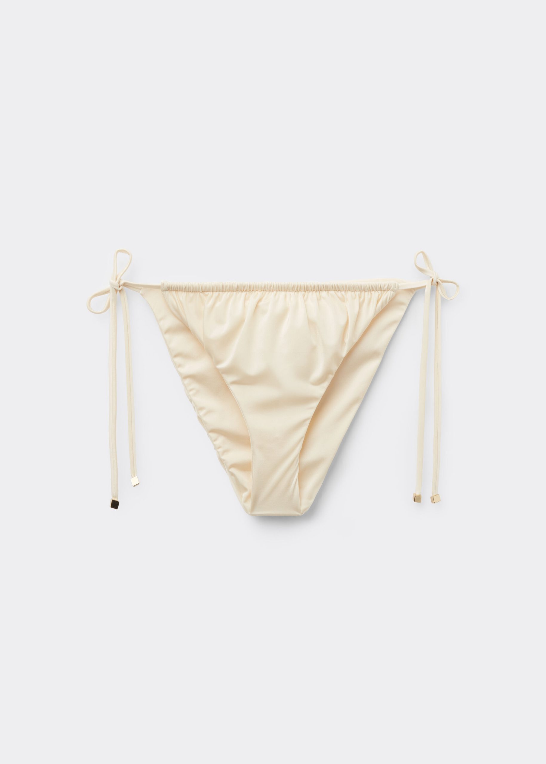 Bikini bottom with side ties to adjust the fit. The style features a bright fabric with a silky effect, embellished by ruffles and gold tips. Fully lined with invisible seams.
