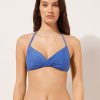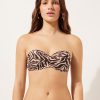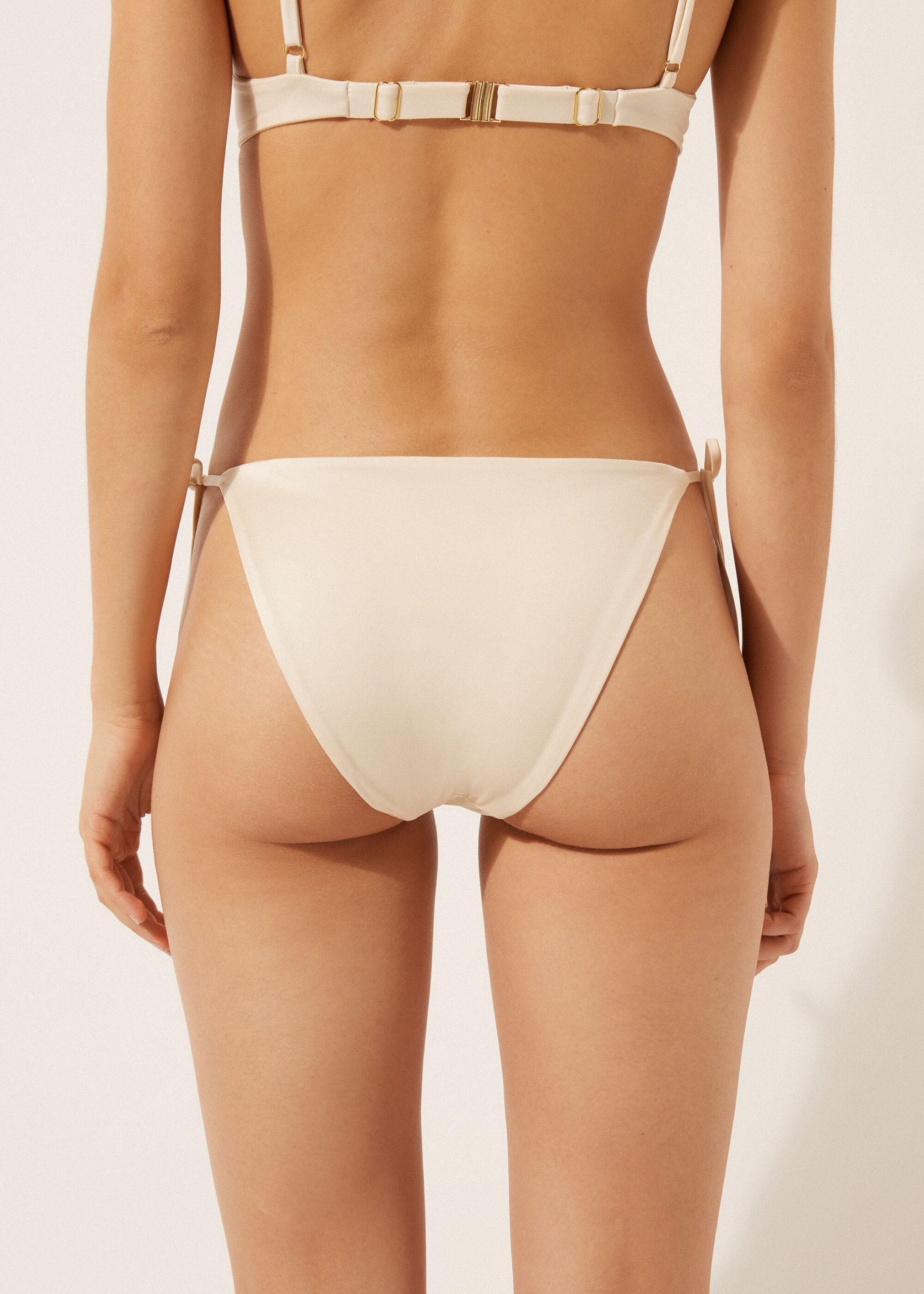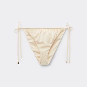 Bikini bottom with side ties to adjust the fit. The style features a bright fabric with a silky effect, embellished by ruffles and gold tips. Fully lined with invisible seams.