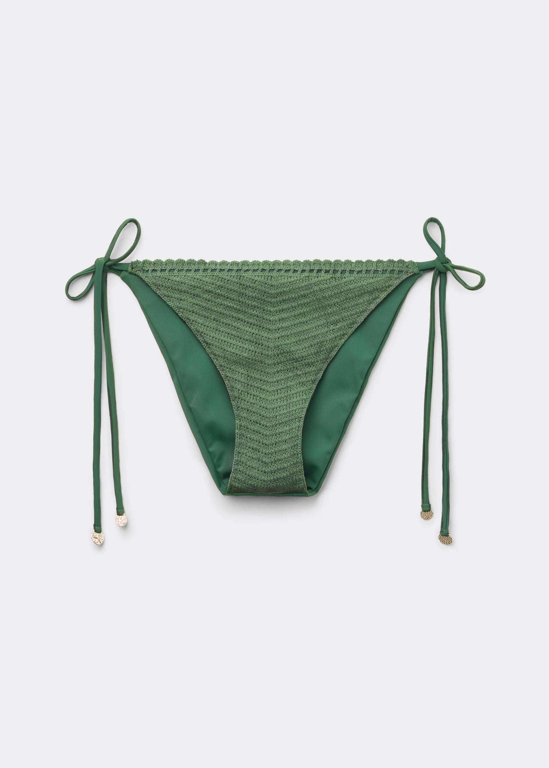 Bikini bottoms with side ties made from refined and sophisticated crochet fabric. The slightly rounded waist at the front allows for both a classic or more high-cut fit, depending on one’s physique. Fully lined with invisible seams.