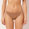 String bikini bottoms with side ties to adjust the fit. The slightly rounded waist at the front allows for both a regular and more high-cut fit, depending on one’s physique. It features a minimal fit that exalts the silhouette with a touch of sensuality and refinement. The bright silk-effect fabric embellished by elegant golden details radiates a sophisticated sensation of discrete luxury.