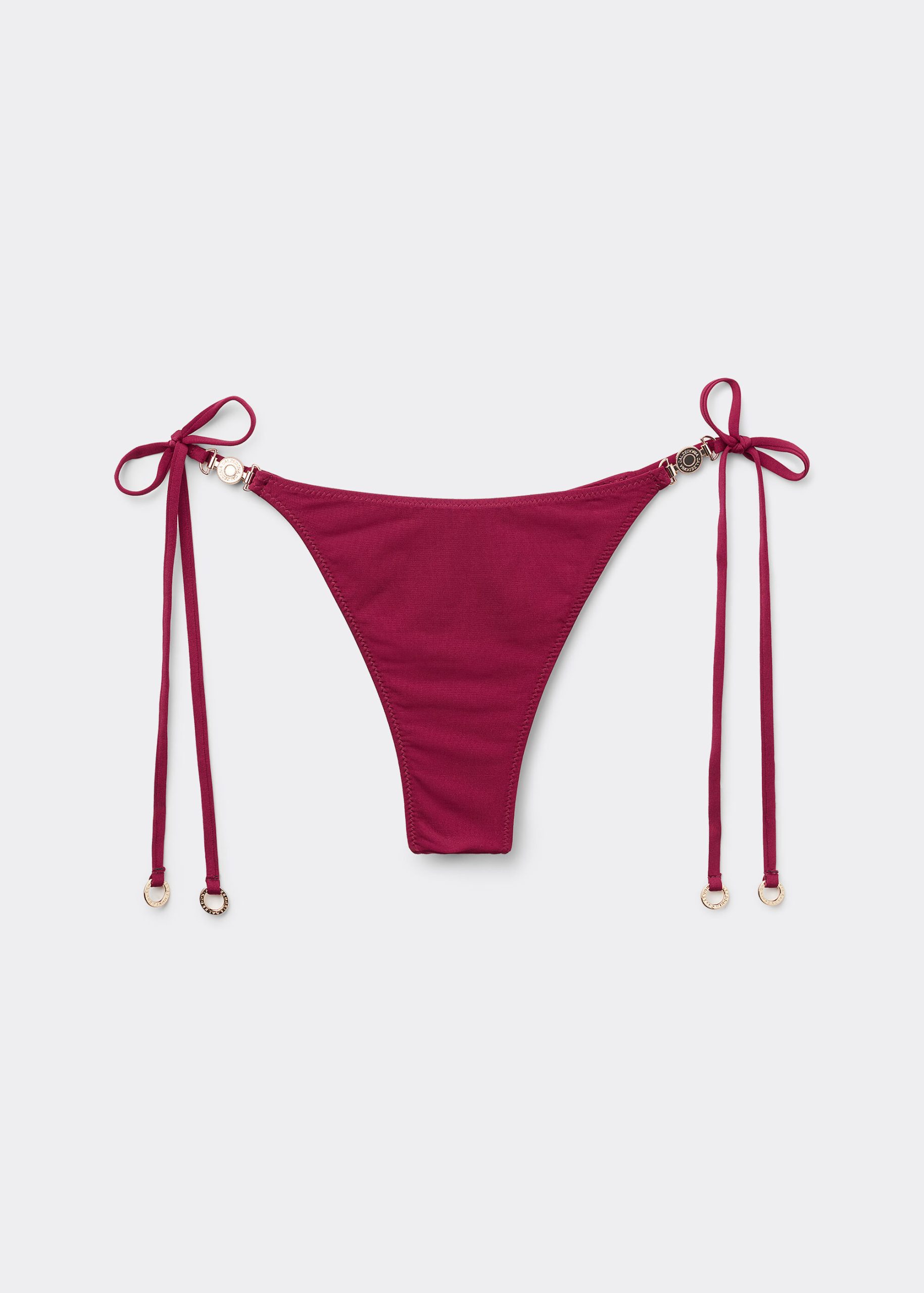 Thong bikini bottoms with side string ties to adjust the fit. It features a minimal fit that exalts the silhouette with a touch of sensuality and refinement. The slightly rounded waist at the front allows for both a regular and more high-cut fit, depending on one’s physique. The bright silk-effect fabric embellished by elegant golden details radiates a sophisticated sensation of discrete luxury. Fully lined with invisible seams.