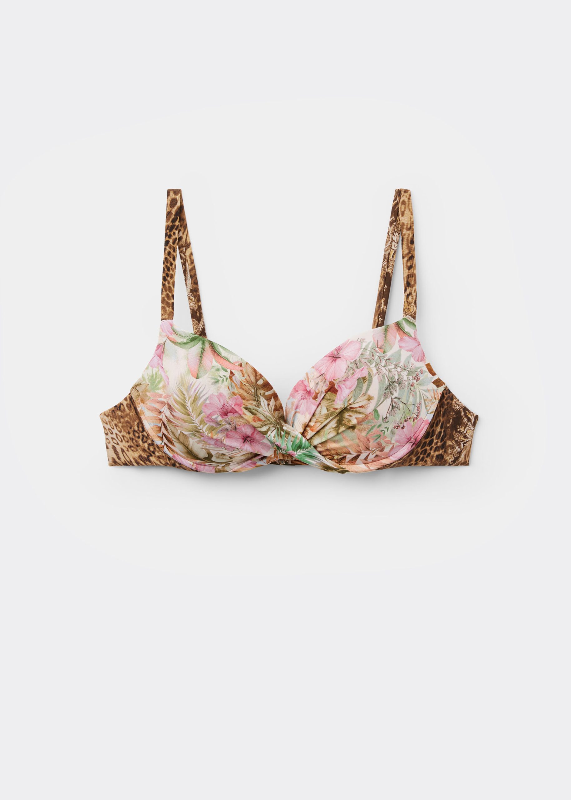 Super push-up bikini top with super graduated padding and underwire for a one-size-larger effect. Ruffly style detail at the center to create movement on the décolleté. A vibrant pattern that combines tropical floral prints and delicate colors with animal print details. Adjustable thin straps. Back hook-and-eye closure and adjuster to improve the fit of the band.
