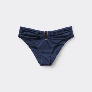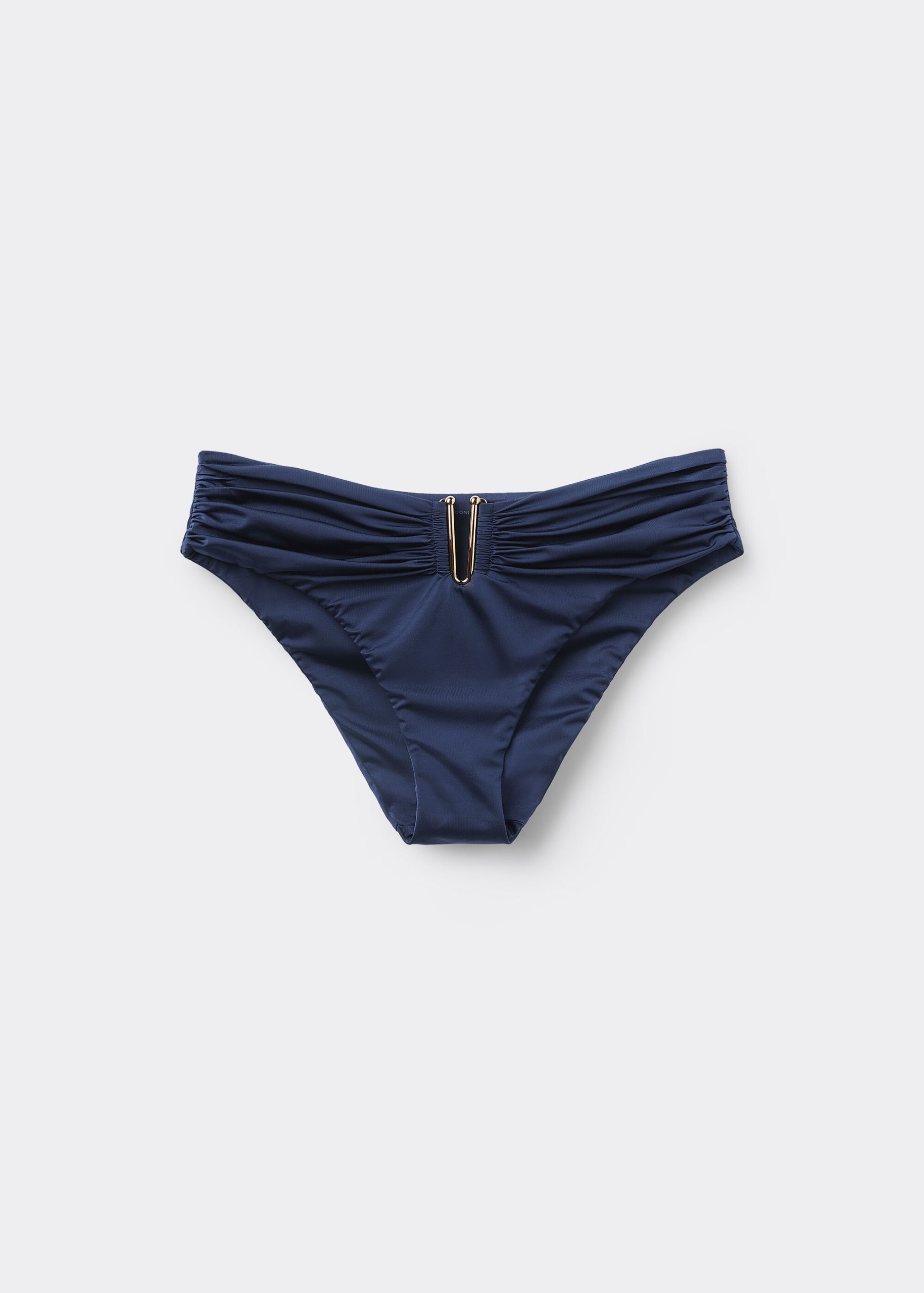 High waist bikini bottom in lined fabric featuring a shiny texture and ruching at the waist with gold accessory closure.