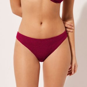 Fully lined bikini bottoms with invisible seams in a crinkle fabric with a three-dimensional effect. The slightly rounded waist allows it to be worn either as normal or with the legs higher to show off the physique.