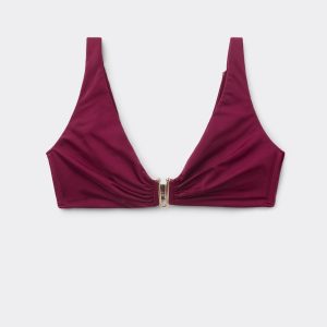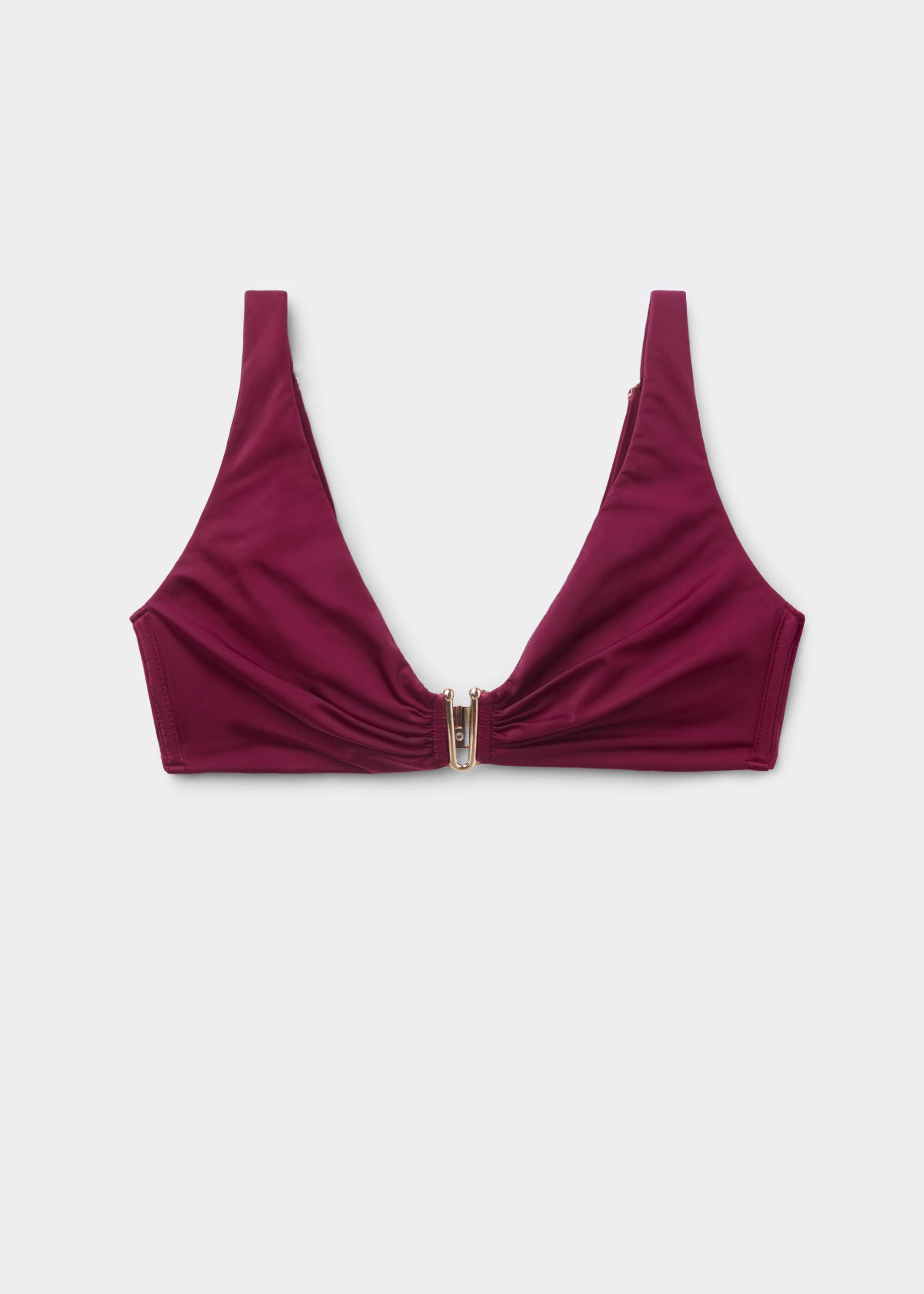 Tank-style bikini top, wireless and unpadded for a natural effect. The side boning guarantees good support. The style features bright fabric with a gold accessory at the center of the bust. Back closure with two sets of hooks.