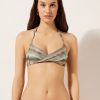 Tank-style bikini top, wireless and unpadded for a natural effect. The side boning guarantees good support. The style features bright fabric with a gold accessory at the center of the bust. Back closure with two sets of hooks.