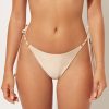 Wireless tank-style bikini top with lightly padded cups. The side boning helps support the bust. The style features an opening at the center of the bust embellished with two small nickel free rings. Three-dimensional especially soft fabric with diagonal motif. Adjustable shoulder straps and thin tie closure on the back embellished with golden tips.
