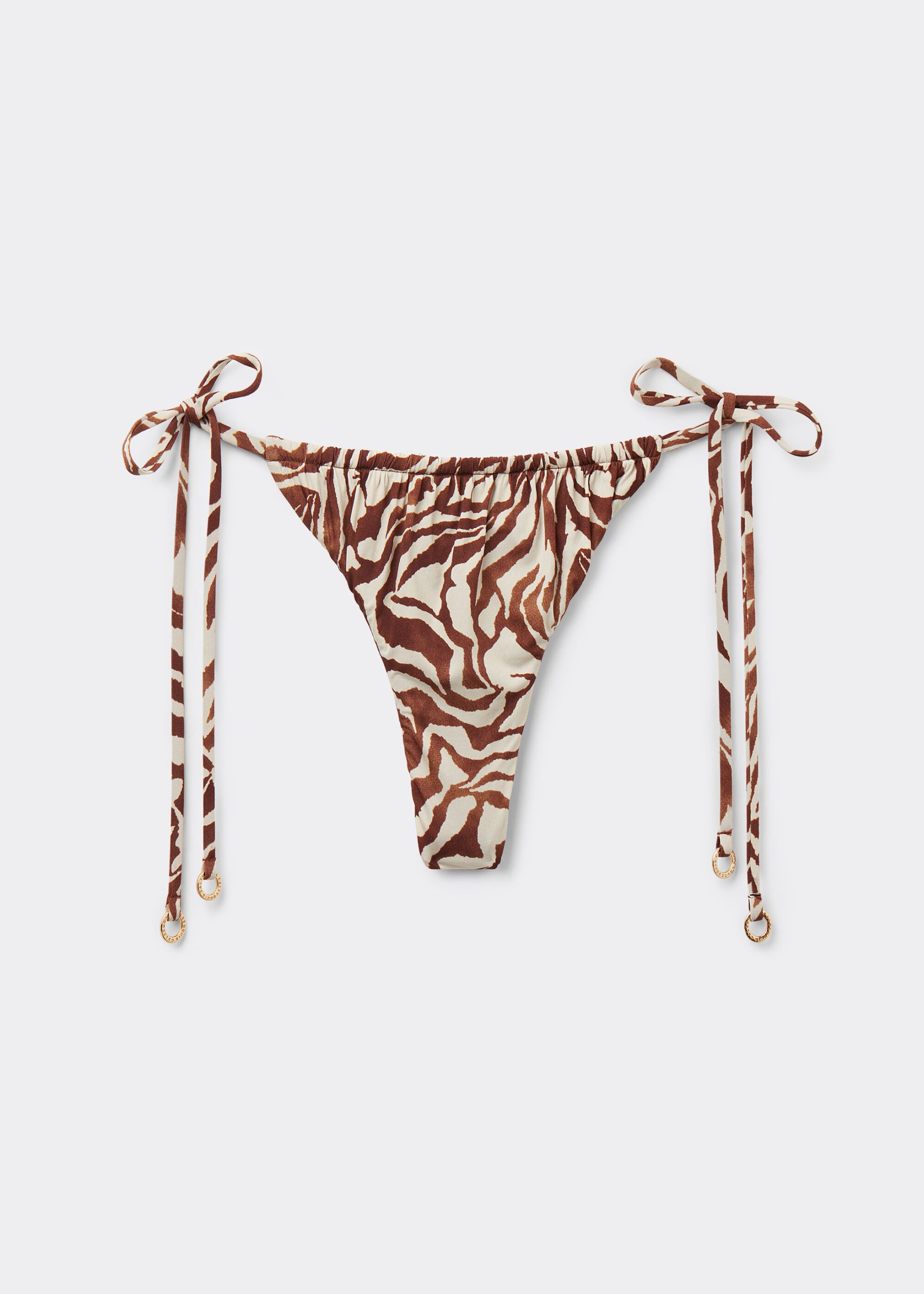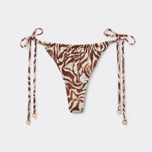 Thong bikini bottom with adjustable thin sides. The slightly rounded front allows for wearing it either as normal or with the legs higher on the sides to show off the physique. The style features a sophisticated Brown Zebra print. Fully lined with invisible seams.