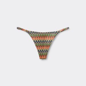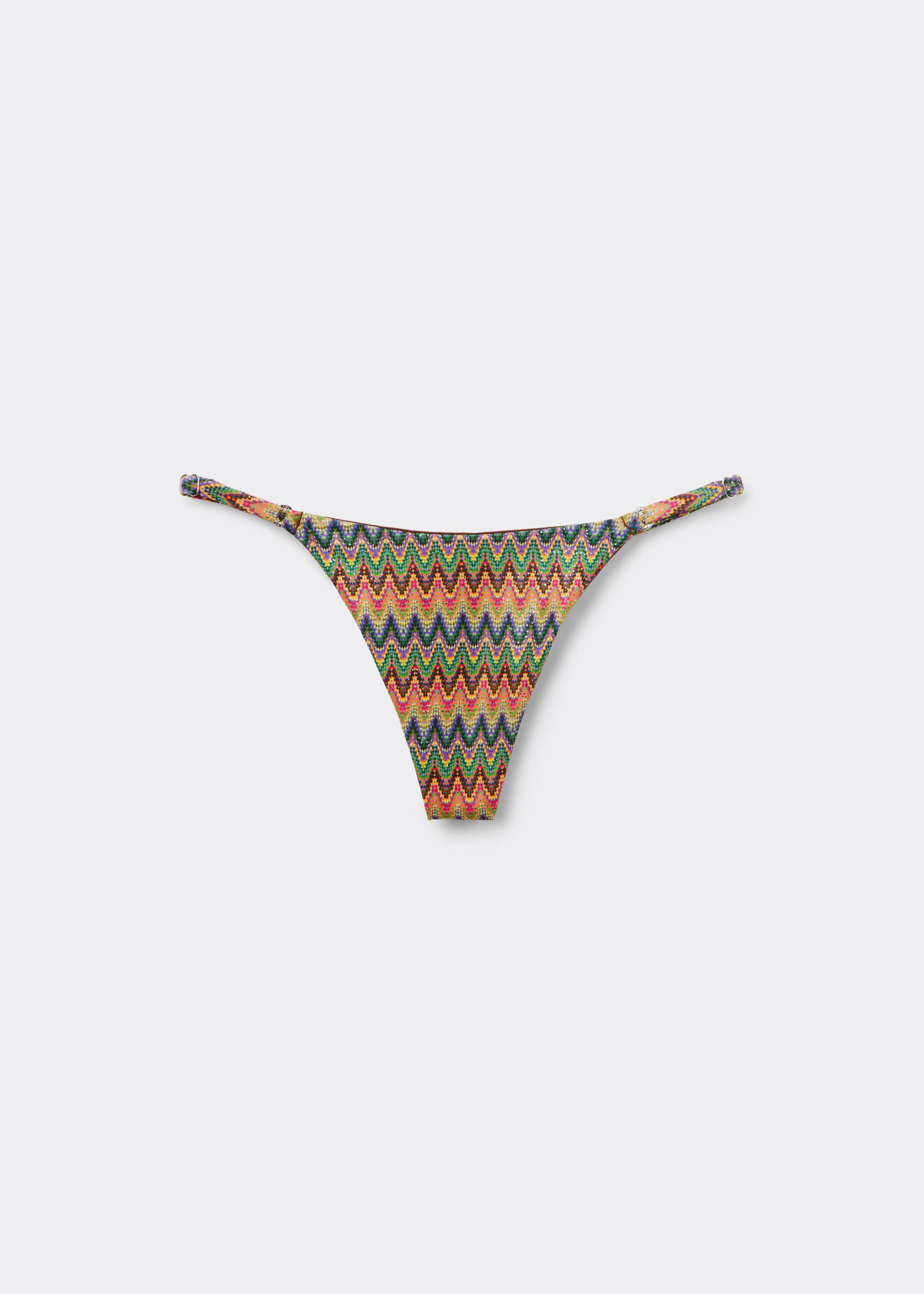 Thong bikini bottoms with adjustable thin sides. The slightly rounded front allows for wearing it either as normal or with the legs higher on the sides to show off the physique. The multicolored pattern, featuring a wave motif and a bold mix of bright colors, has a dynamic effect ideal for the summer. Fully lined with invisible seams.