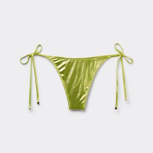 Thong bikini bottoms with adjustable thin sides. The slightly rounded front allows for wearing it either as normal or with the legs higher on the sides to show off the physique. The style features an extra shiny, metallic effect fabric. Fully lined with invisible seams.