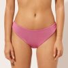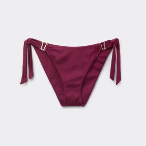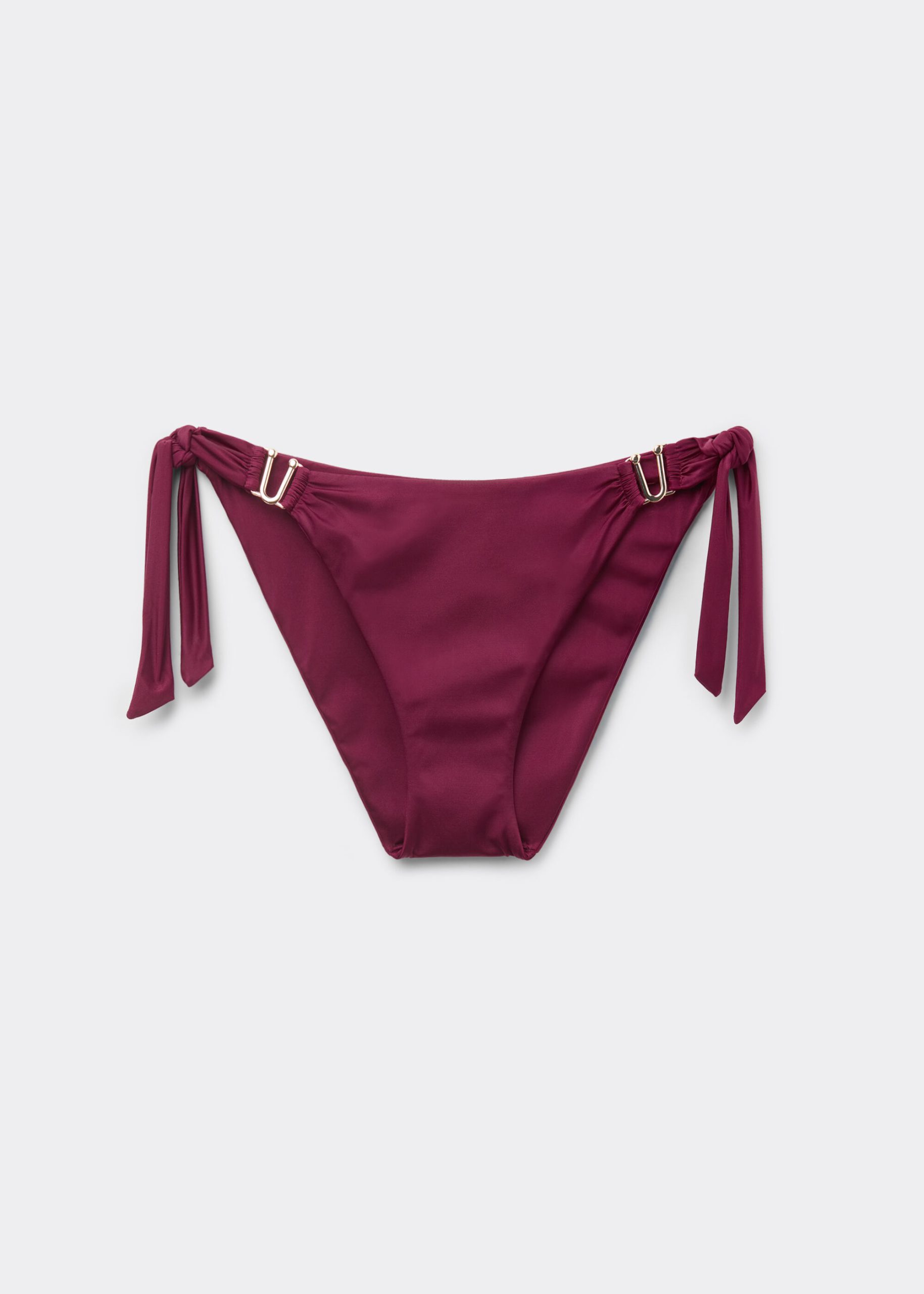 Bikini bottom with side tie closure to adjust the fit. Lined fabric featuring a shiny texture and ruching at the waist with gold accessory closure.