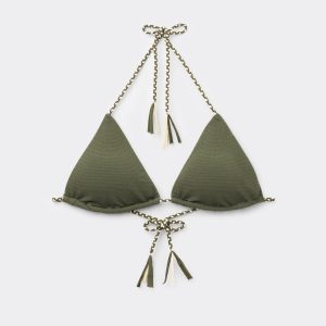 Slide triangle bikini top with removable padding, wireless for a natural effect. The 3D crinkled fabric, enriched by a braided string, provides a touch of sophisticated elegance. The shoulder straps have eyelets on the ends so they can be hooked onto the back band or tied behind the neck. Back string tie closure.