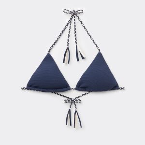 Slide triangle bikini top with removable cups and no underwire for a natural effect. The style is defined by a three-dimensional monochrome fabric with a slightly crinkled texture that adds depth and sophistication. The shoulder straps and the back string tie closure feature a two-toned braid.
