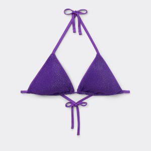 Slide triangle bikini top with removable padding, wireless for a natural effect. Made in stylish shiny lamé fabric that provides a luminous and sophisticated effect. The shoulder straps have eyelets on the ends so they can be hooked onto the back band or tied around the neck. Back string tie closure.