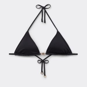 Slide triangle style bikini top with removable padding, wireless, featuring a minimal fit that exalts the silhouette with a touch of sensuality and refinement. The bright silk-effect fabric embellished by elegant golden details radiates a sophisticated sensation of discrete luxury. The straps have an eyelet at the end to insert them on the underband or fasten behind the neck, while the string tie fastening on the back guarantees an adjustable fit. Perfect for a sophisticated and irresistible summer look.