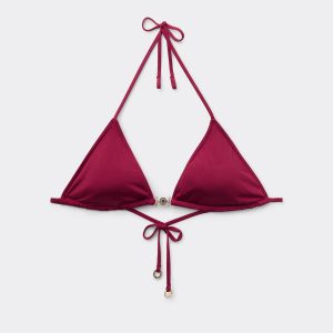 Slide triangle style bikini top with removable padding, wireless, featuring a minimal fit that exalts the silhouette with a touch of sensuality and refinement. The bright silk-effect fabric embellished by elegant golden details radiates a sophisticated sensation of discrete luxury. The straps have an eyelet at the end to insert them on the underband or fasten behind the neck, while the string tie fastening on the back guarantees an adjustable fit. Perfect for a sophisticated and irresistible summer look.