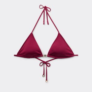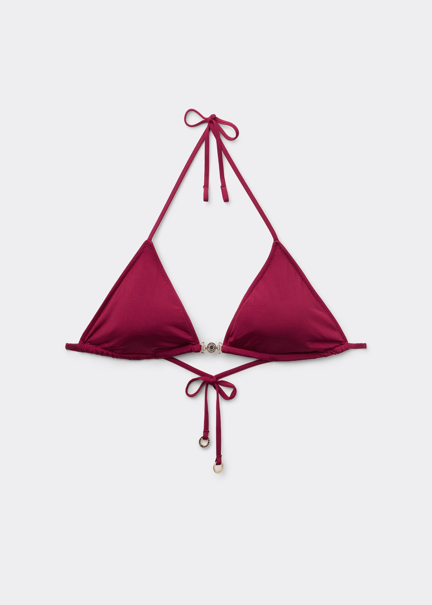 Slide triangle style bikini top with removable padding, wireless, featuring a minimal fit that exalts the silhouette with a touch of sensuality and refinement. The bright silk-effect fabric embellished by elegant golden details radiates a sophisticated sensation of discrete luxury. The straps have an eyelet at the end to insert them on the underband or fasten behind the neck, while the string tie fastening on the back guarantees an adjustable fit. Perfect for a sophisticated and irresistible summer look.