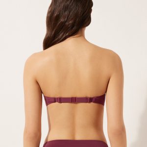 Slide triangle bikini top with removable padding and no underwire for a natural effect. The style features a particularly soft three-dimensional diagonal-motif fabric. The shoulder straps have eyelets on the ends so they can be hooked onto the back band or tied behind the neck. Back string tie closure embellished with silver tips.