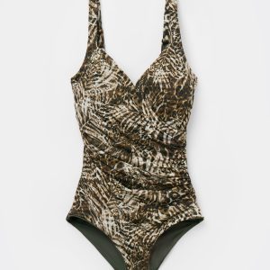 One piece swimsuit with lightly padded cups and underwire. The crisscross draping shapes and highlights the silhouette. Shaping effect on the abdomen. Reminiscent of animal print, the foliage pattern brings together exotic leaf designs with motifs that evoke markings from the animal world. Adjustable shoulder straps. Fully lined in back. Regular bottom coverage in back.