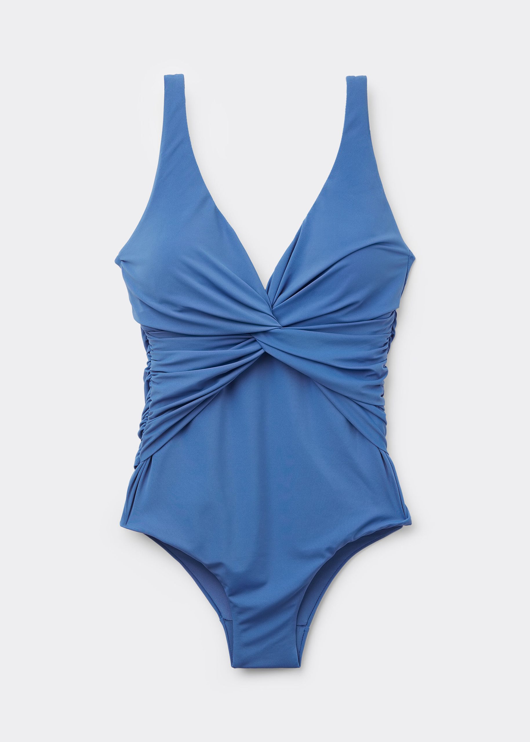 One piece wireless swimsuit with removable cups. The draping and crisscross create a front and backmotif. The extremely soft fabric makes it pleasant to wear, offering a light and comfortable feel on the skin. Adjustable shoulder straps. Fully lined in back. Regular bottom coverage in back.